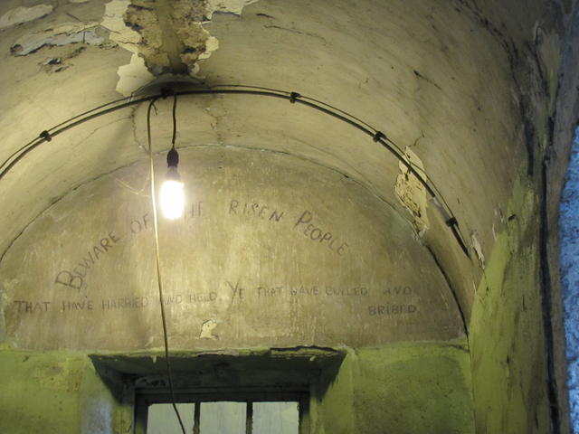 The tour finished up in the yard where the leaders of the 1916 uprising were executed. This is the cross that marks where James Connolly, wounded in the uprising and unable to stand, was tied to a chair for the firing squad. The large wooden gate is where he was brought in from the Royal Hospital in ambulance for his execution.