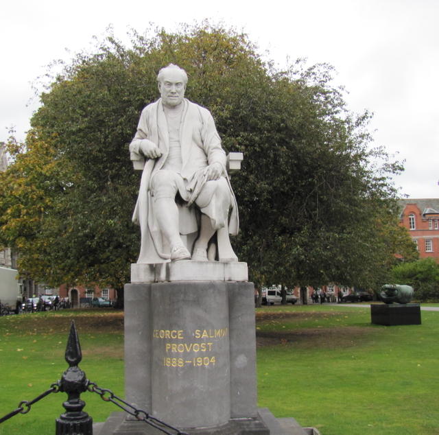 I was able to take a couple of pictures on campus of some interesting things, including the campanile in the main yard, and the nearby statue of Provost Salmon, who famously said that women would be admitted to Trinity over his dead body, then was forced to sign a statute allowing them in. When he did so, he said that he had signed with his hand, but not with his heart. A short time later he died of a heart attack. The story goes that he was buried at the entrance used by the women students, forcing them to step over his body2.