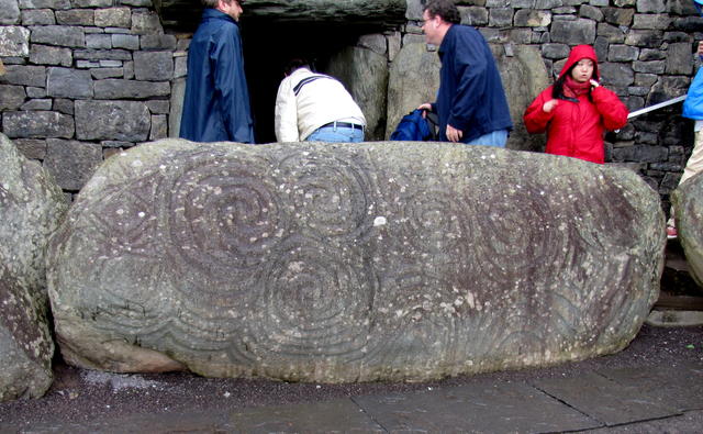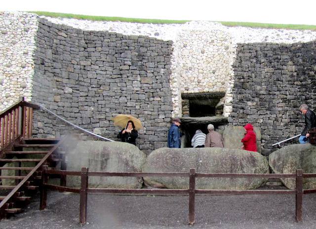 A look up at Newgrange from the area where you wait for your guide. See the nice blue sky? It’s a filthy liar. Rain is falling.For purposes of preserving the site, visitors to Newgrange are limited. Here’s the whole crowd from our tour waiting for our guide to take us up. The tractor is just cutting the grass.An unexcavated (and smaller) passage tomb in a nearby field.One of the megaliths that surround Newgrange and dot the hills all throughout the area.The entry stone at Newgrange. Archaeologists think the original builders had those who wished to enter the tomb climb over the stone, letting it represent the barrier between life and death, between the physical and the spirit world.Fortunately, in modern times, we get to climb over on a stairway. Note the opening above the main opening – that’s for the sun’s light at Winter Solstice.