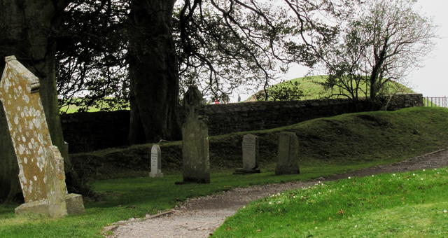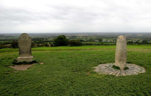 The churchyard at Tara. You can see the Mound of the Hostages rising in the background.These are the sorts of trenches Mary warned us about. You can’t tell very well from the picture, but they are at least six feet deep, and some are easily fifteen feet deep, with steep, slick, grassy sides.Some perspective: this is the view of the top of the Hill of Tara from the foot of the hill. Note the two rings of trenches. Yeah, I totally ignored Mary’s advice about them.On top of the Hill of Tara. The stone to the right is the Lia Fail, the Stone of Kings. The stone to the left marks the grave of 400 Irishmen killed here in the 1798 rebellion.
